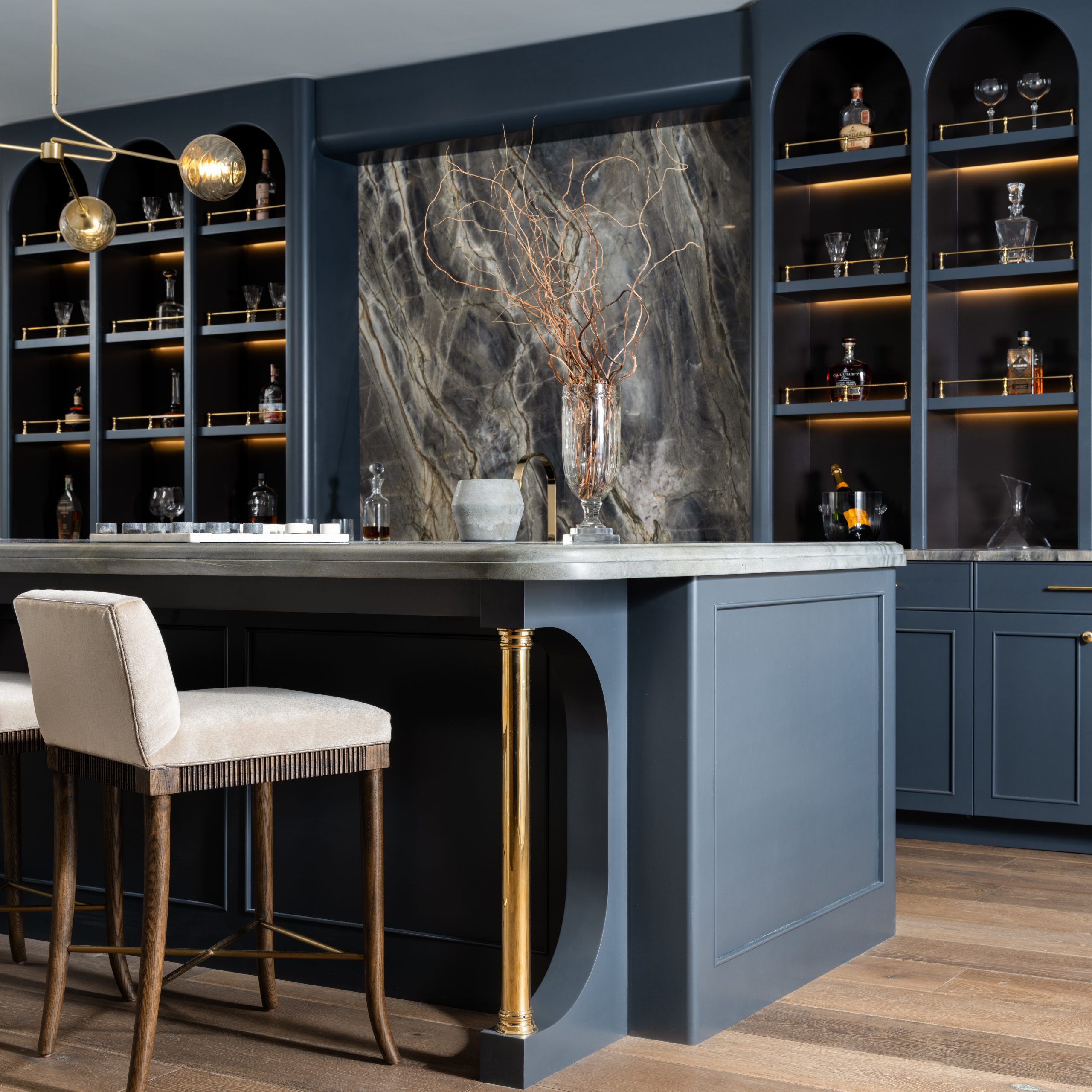 Our brass bottle rails add both function and refinement to open shelving. Custom configurations are available to suit any layout or design.