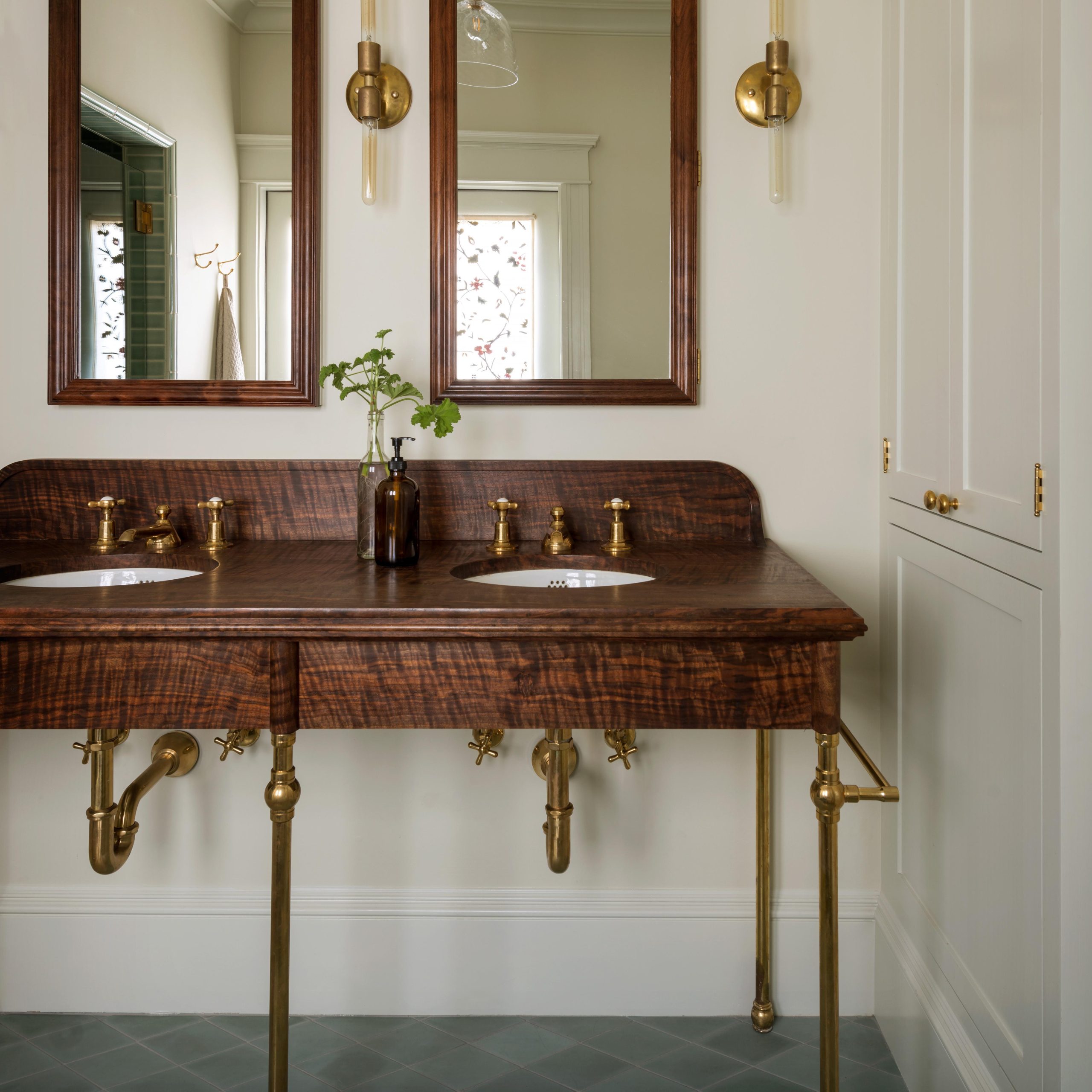 The Victorian vanity console combines exposed structural elements with functional detailing, including integrated towel rails and split collar shelf supports, offering practical lower storage within a robust open-frame design.
